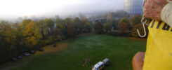 Nahe des Endlandeplatzes des Heißluftballons wurde zwischengelandet und durchgewechselt, sodass schon am ersten Morgen alle mitgereisten Vereinsmitglieder in den Genuss des lautlosen Schwebens über die Täler und Hügel westlich Augsburgs kamen. Noch einige weitere Manöver wurden trainiert, bis der Ballon schließlich nördlich von Attenhausen zur Landung ansetzte.